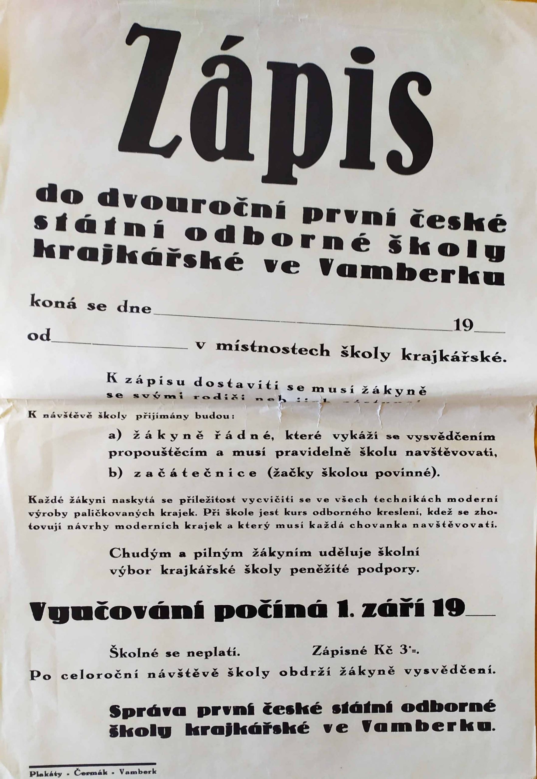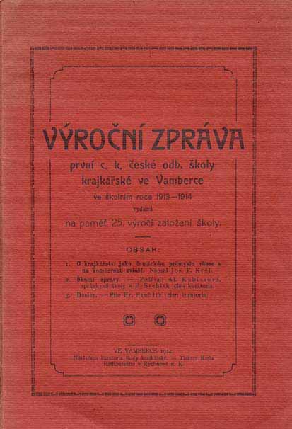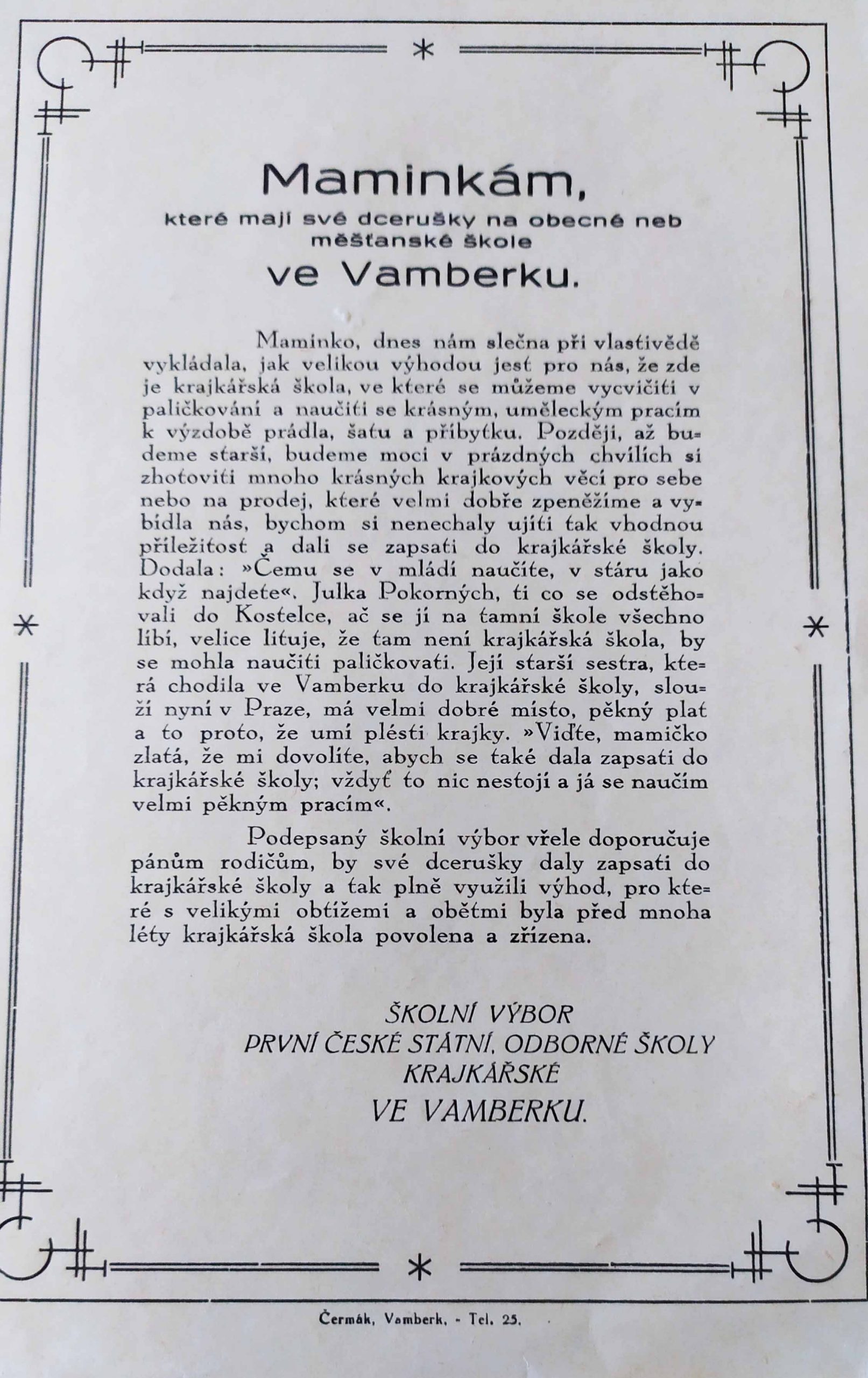 Výroční zpráva první c. k. české odborné školy krajkářské ve Vamberku 1913–1914 Zápis do první c. k. české odborné školy krajkářské ve Vamberku Maminkám – od první c. k. české odborné školy krajkářské ve Vamberku